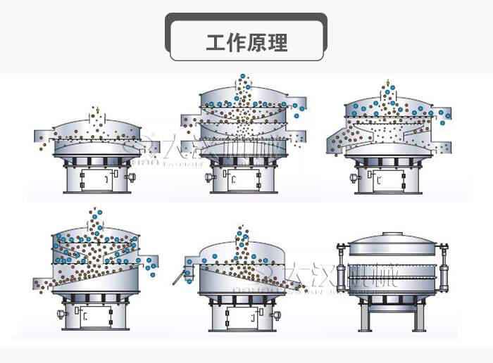 它是以直立式電機(jī)作激振源,通過調(diào)節(jié)電機(jī)上、下兩端安裝有偏心重錘,可將電機(jī)的旋轉(zhuǎn)運(yùn)動(dòng)轉(zhuǎn)變?yōu)樗健⒋怪薄A斜的三次元運(yùn)動(dòng),然后再把這個(gè)運(yùn)動(dòng)傳遞給篩面,使篩面上的物料做外擴(kuò)漸開線運(yùn)動(dòng),從而實(shí)現(xiàn)對(duì)粉狀物料進(jìn)行精篩分、概率篩分等。