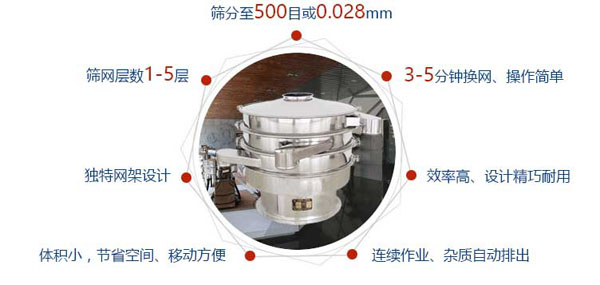 3、篩網(wǎng)不阻塞、粉末不飛揚、篩分細可達500目(28微米)過濾細可達5微米。