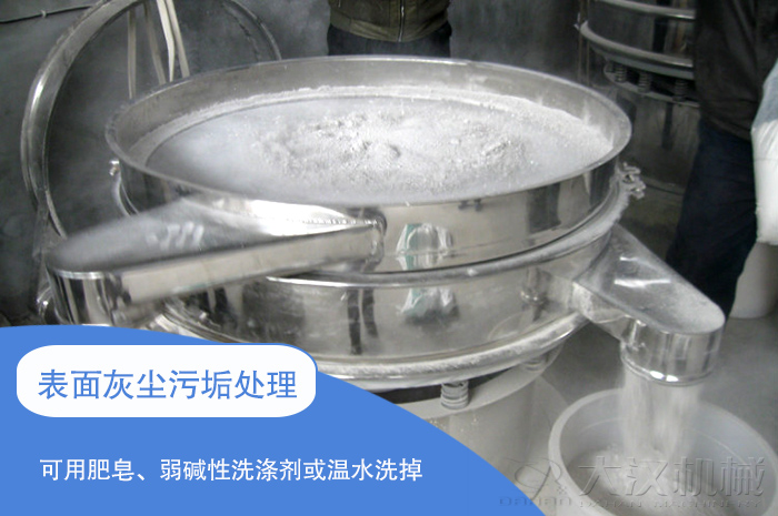不銹鋼振動(dòng)篩表面有漂白劑以及各種酸附著,立即用水沖洗,再用氨溶液或中性碳酸蘇打水溶液浸洗,然后再用中性洗滌劑或溫水洗滌。