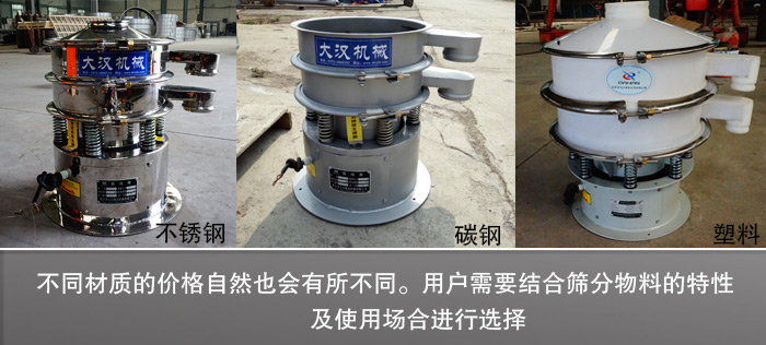 DH-400旋振篩DH-400旋振篩材質有碳鋼、不銹鋼、塑料等3種,不同材質之間會存在原材料采購費用的不同,所以不同材質的價格自然也會有所不同。用戶需要結合篩分物料的特性及使用場合進行選擇。